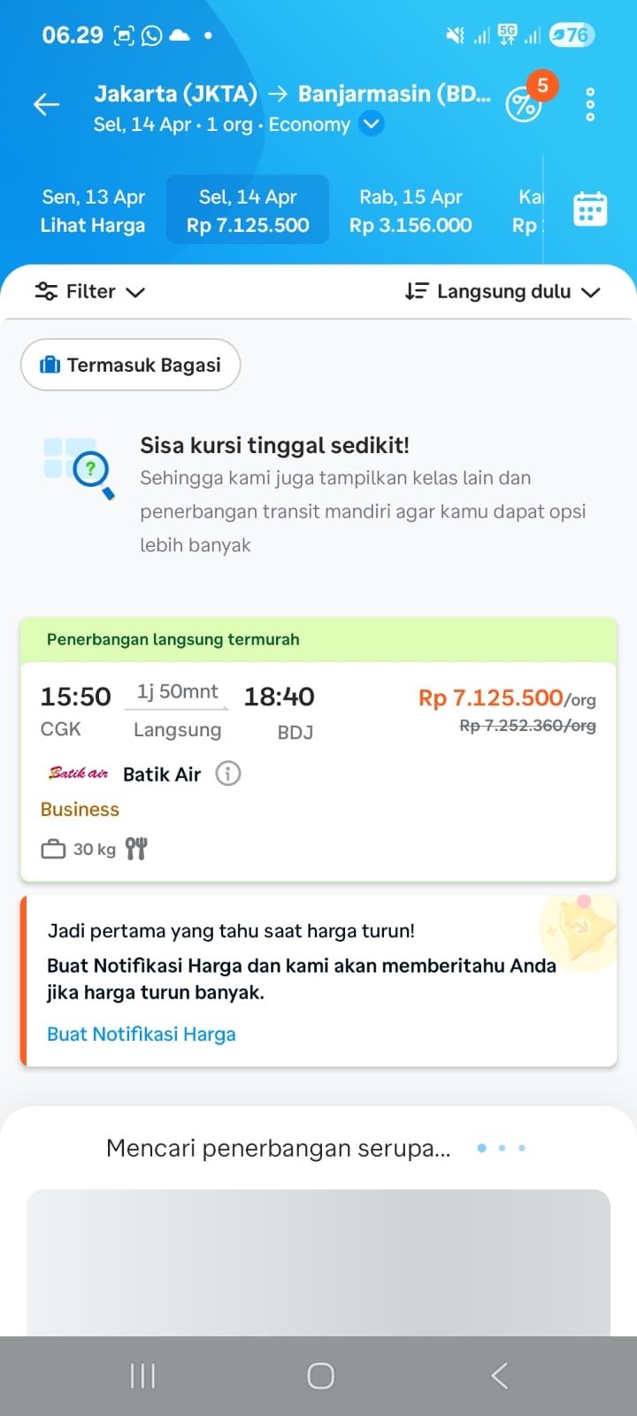 Namun demikian, fakta terkini menunjukkan adanya dinamika harga yang tidak sepenuhnya linear dengan alasan biaya operasional. Untuk penerbangan arah Jakarta menuju Banjarmasin, dalam kondisi pemesanan maksimal sekitar tiga hari sebelum keberangkatan, harga tiket pada salah satu aplikasi pemesanan daring masih berada pada kisaran Rp3.500.000.
