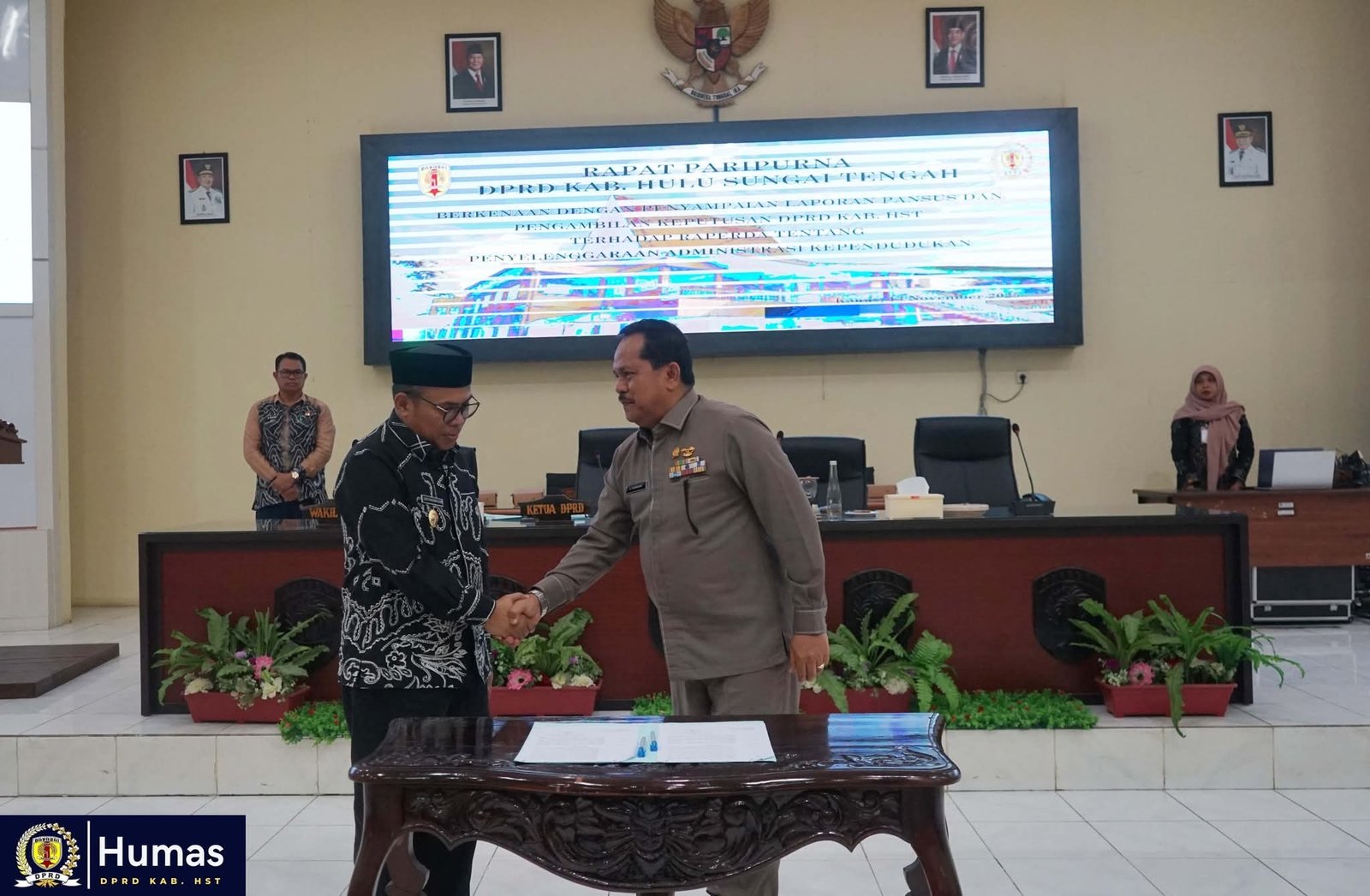 Setelah penyampaian laporan dan pandangan akhir fraksi, rapat dilanjutkan dengan pengambilan keputusan dan penandatanganan persetujuan bersama antara DPRD dan Pemerintah Kabupaten HST.