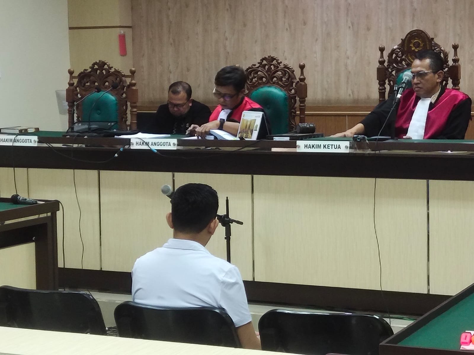 Terdakwa M. Reza Arpiansyah tampak lesu saat mendengarkan putusan yang dibacakan oleh majelis hakim. Majelis hakim Tipikor Banjarmasin, yang diketuai oleh Cahyono Riza Adrianto, menjatuhkan vonis hukuman berat kepada Reza.