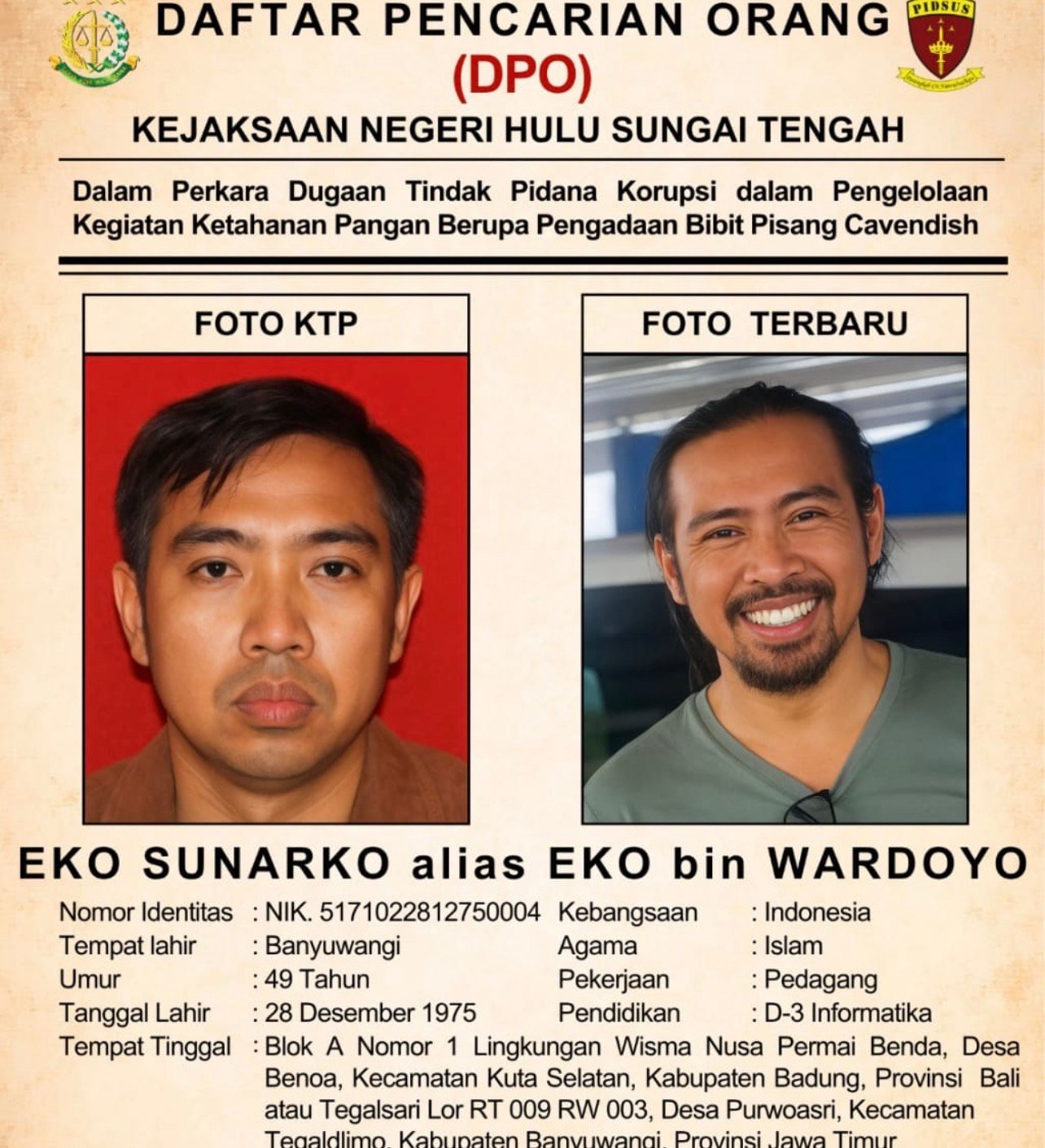 Berdasarkan data Kejari HST, E.S berusia 49 tahun, lahir di Banyuwangi, dengan alamat terakhir di Desa Benoa (Kabupaten Badung, Bali) dan Kabupaten Banyuwangi (Jawa Timur). Ciri khasnya: tinggi 170 cm, kulit sawo matang, wajah oval, rambut hitam lurus, serta berjenggot dan berkumis. Informasi ciri ini diharapkan membantu masyarakat mengenali tersangka.