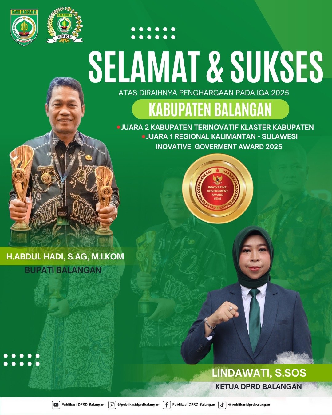 Menurut Hj. Linda Wati, penghargaan IGA 2025 menjadi bukti bahwa inovasi yang dilakukan pemerintah daerah telah berjalan pada jalur yang tepat dan memberikan dampak positif terhadap pelayanan publik maupun pembangunan daerah.