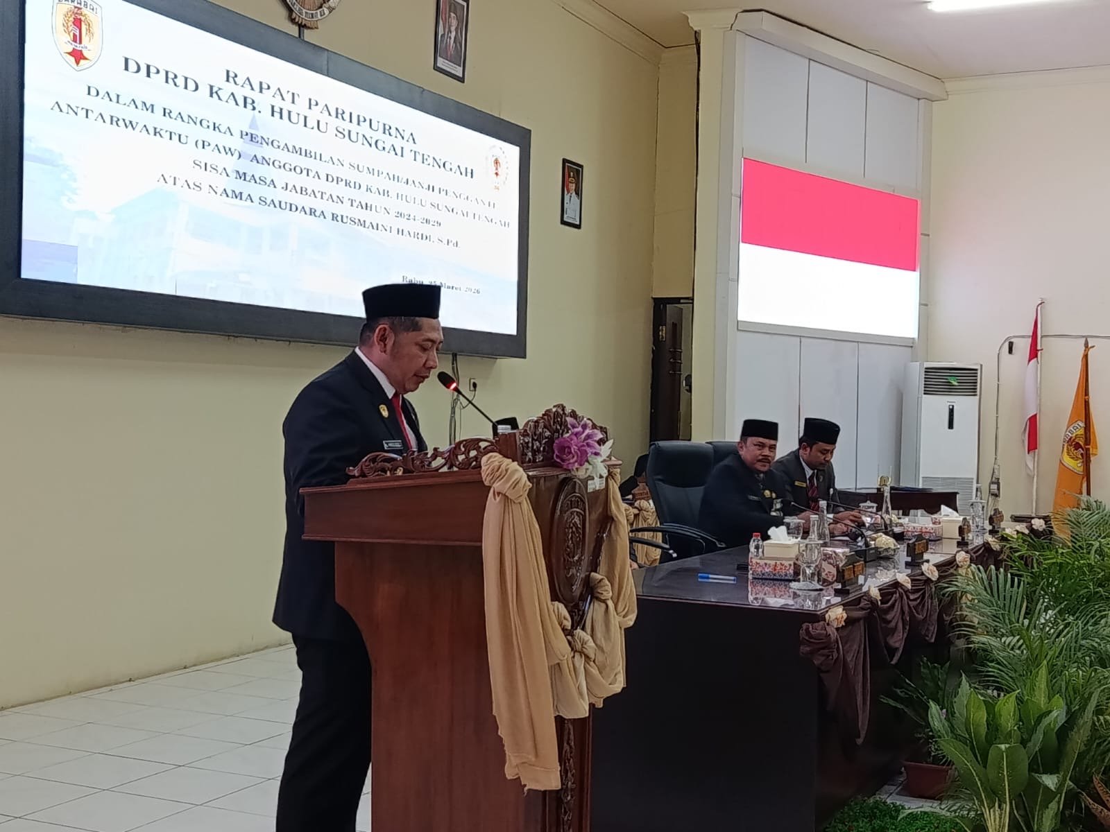 Barabai, ( KATAKUNCI ) – Rapat paripurna pelantikan anggota DPRD Kabupaten Hulu Sungai Tengah (HST) pengganti antar waktu (PAW) Rusmaini Hardi dari Partai Demokrat berlangsung tertib pada Rabu (25/3/2026) pukul 11.00 WITA di Ruang Rapat DPRD HST Lantai 2.