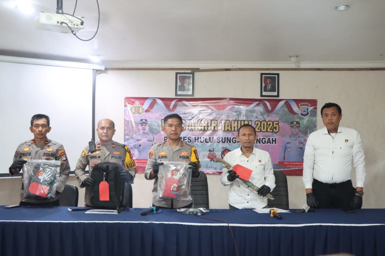 “Saat ini berkas perkara sudah dilimpahkan ke kejaksaan untuk proses hukum selanjutnya,” ujar Kapolres HST dalam acara rilis akhir tahun Rabu (31/12/2025) pagi di Aula Bhayangkara. Pada kesempatan itu, barang bukti berupa parang dan pakaian bernoda darah juga ditampilkan untuk publik.