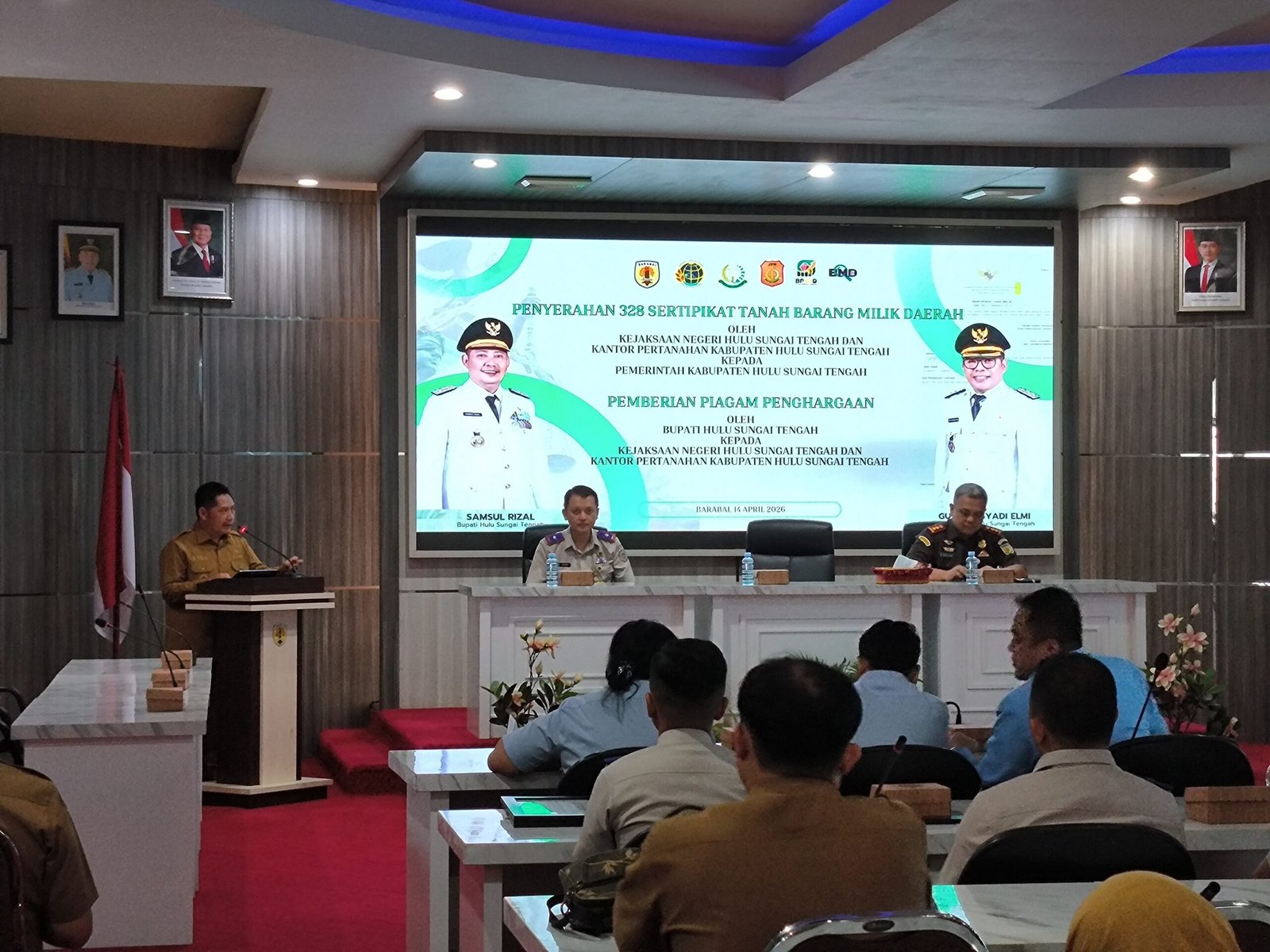 Bupati HST Samsul Rizal (kiri) saat memberikan sambutan pada kegiatan penerimaan sertifikat tanah barang milik daerah di auditorium Setda HST, Selasa (14/4/2026). KATAKUNCI/Muhammad Ramli