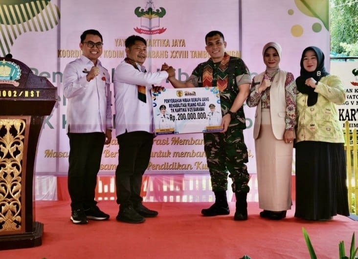 Barabai (KATAKUNCI) – Pemerintah Kabupaten Hulu Sungai Tengah (HST) menyerahkan hibah dalam bentuk uang kepada Yayasan Kartika Jaya Koordinator Kodim 1002/HST untuk rehabilitasi bangunan TK Kartika V-25 Barabai.