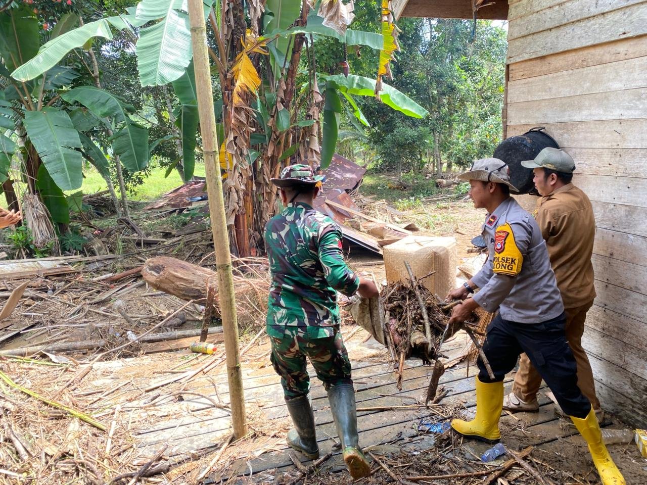 Di bawah komando IPDA Fajar, personel Polsek Halong membagi kekuatan untuk memastikan titik-titik vital di Desa Binuang Santang segera bersih, di antaranya menyisir rumah-rumah penduduk yang terdampak paling parah, membantu menyingkirkan material sampah organik dan lumpur yang masuk ke dalam rumah.