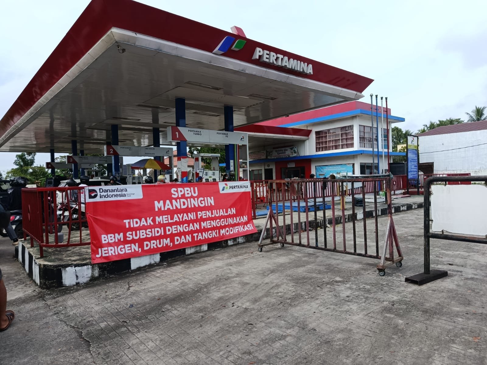 Baleho bertuliskan “SPBU Mandingin tidak melayani penjualan BBM Subsidi dengan menggunakan jirigen, drum, dan tangki modifikasi” itu sengaja dipasang sebagai bentuk kepatuhan terhadap regulasi nasional yang ketat.